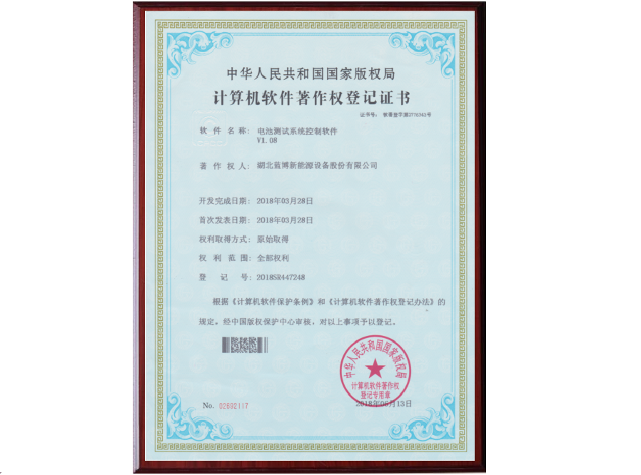 根據(jù)《計(jì)算機(jī)軟件保護(hù)條例》和《計(jì)算機(jī)軟件著作權(quán)登記辦法》的規(guī)定,經(jīng)中國版權(quán)保護(hù)中心審核,中華人民共和國國家版權(quán)局對(duì)藍(lán)博公司提交的電池測(cè)試系統(tǒng)軟件著作權(quán)認(rèn)定為原始取得并予以登記,從頒證之日起,這套電池測(cè)試系統(tǒng)軟件的版權(quán)將得到中國版權(quán)保護(hù)中心的有效保護(hù)。