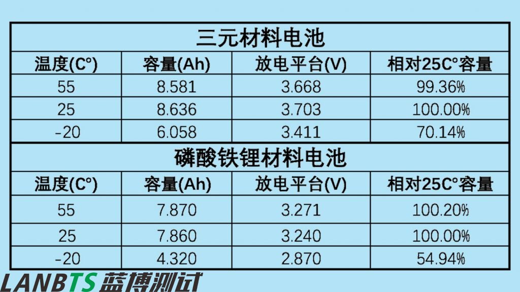 “相對25℃容量”是指不同溫度條件下放電容量與25℃時放電容量的比值。該數(shù)值能夠準確反映出電池在不同溫度條件下續(xù)航的衰減,越接近100%,電池表現(xiàn)越好。