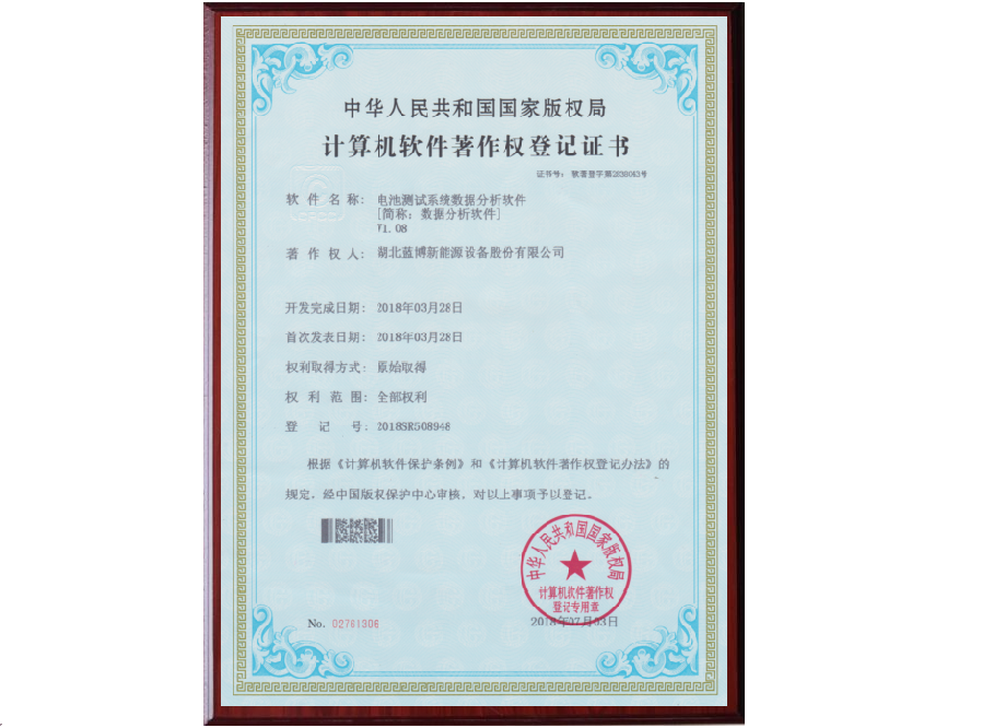 根據(jù)《計(jì)算機(jī)軟件保護(hù)條例》和《計(jì)算機(jī)軟件著作權(quán)登記辦法》的規(guī)定,經(jīng)中國版權(quán)保護(hù)中心審核,中華人民共和國國家版權(quán)局對(duì)藍(lán)博公司提交的電池測(cè)試系統(tǒng)軟件著作權(quán)認(rèn)定為原始取得并予以登記,從頒證之日起,這套電池測(cè)試系統(tǒng)軟件的版權(quán)將得到中國版權(quán)保護(hù)中心的有效保護(hù)。